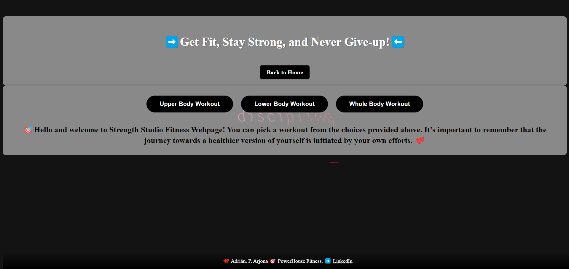 This Web-project, PowerHouse Fitness, is designed to provide users with an engaging and informative platform to discover a variety of upper body workouts. With a clean and modern design, my website offers easy navigation and clear instructions for each workout, allowing users to challenge themselves and achieve their fitness goals. From beginners to advanced levels, there is something for everyone on PowerHouse Fitness. The site is one of my testament to the importance of staying active and fit, and its intuitive design and user-friendly features make it a valuable resource for anyone looking to improve their whole body strength and overall health.